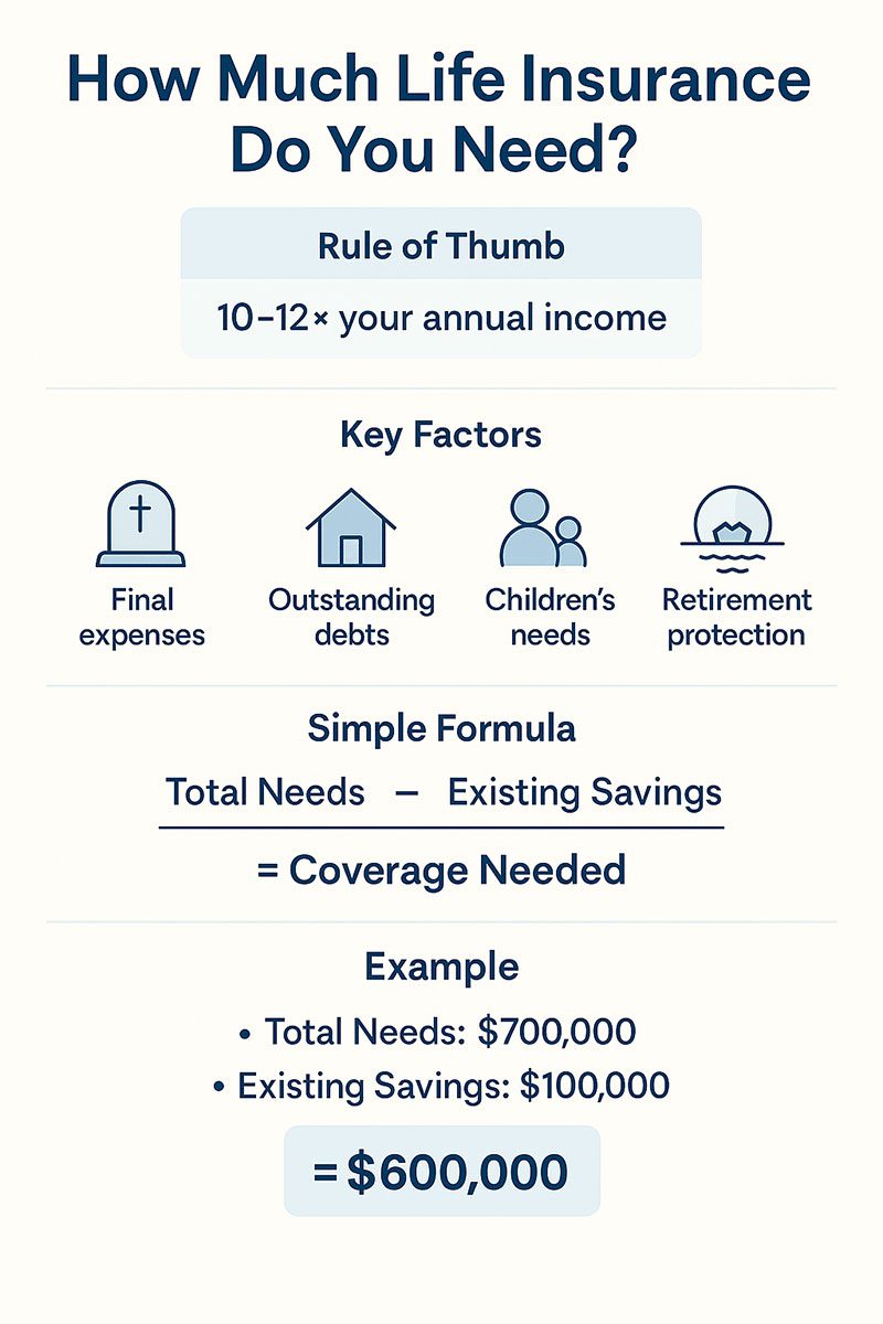 A common starting point is to buy coverage equal to 10–12 times your annual income. For example, if you earn $75,000 per year, you may need between $750,000 and $900,000 in coverage.