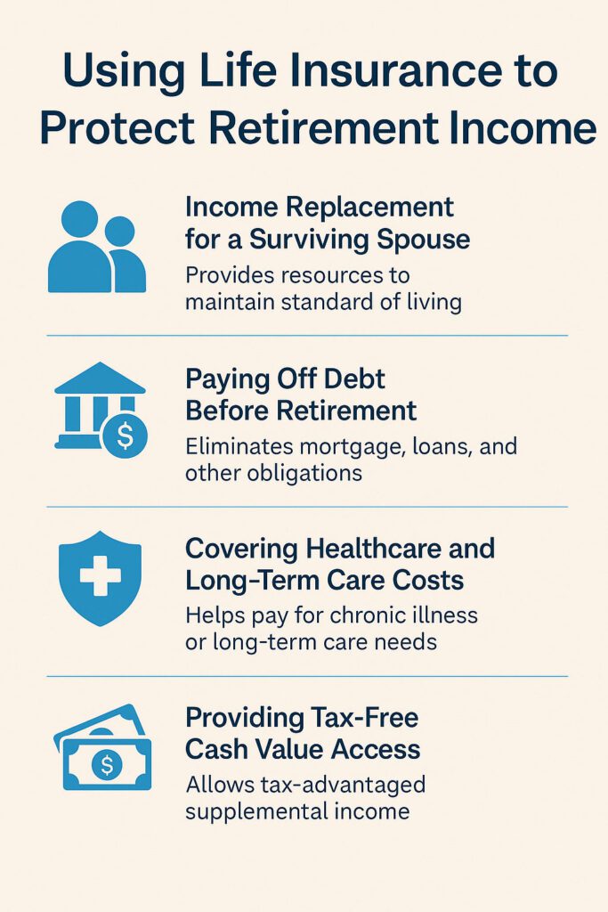 When most people think of life insurance, they think of it as a way to provide for loved ones after death. But life insurance also plays a powerful role in protecting retirement income for both you and your spouse.